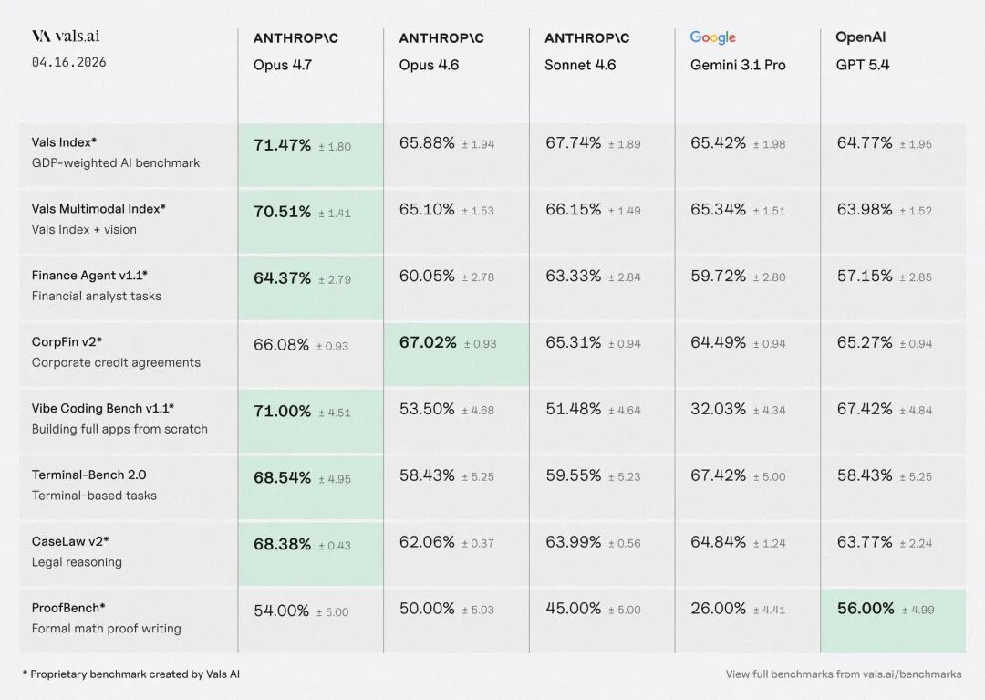AI Visual Insight: The image shows Claude Opus 4.7 leading across several composite evaluations, with a particularly notable jump on benchmarks such as Vals Index. This suggests stronger consistency across tasks, better holistic reasoning, and improved engineering performance in real-world scenarios.