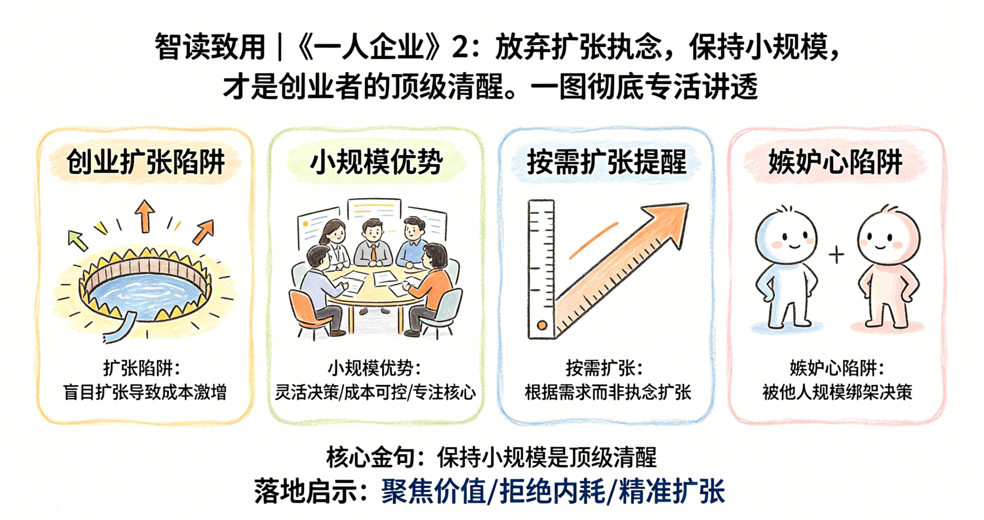 Core Summary: Based on Chapter 2 of Company of One, this article reconstructs a methodology for small-scale entrepreneurship. It explains why expansion can amplify profit pressure and management complexity, shows how technology tools allow solo businesses to operate with high efficiency, low cost, and strong flexibility, and provides a practical framework for on-demand expansion, mindset calibration, and execution.