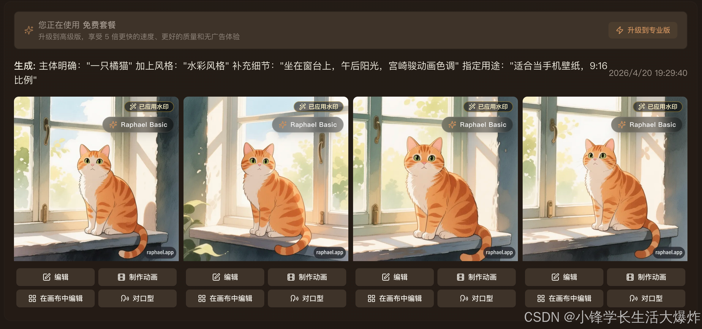 AI Visual Insight: This interface shows the linkage between Raphael AI’s text input area, parameter controls, and generated outputs. It indicates that the platform uses a typical generative UI architecture based on prompt input, aspect ratio and style configuration, and multi-result output, which is well suited for fast A/B comparison.